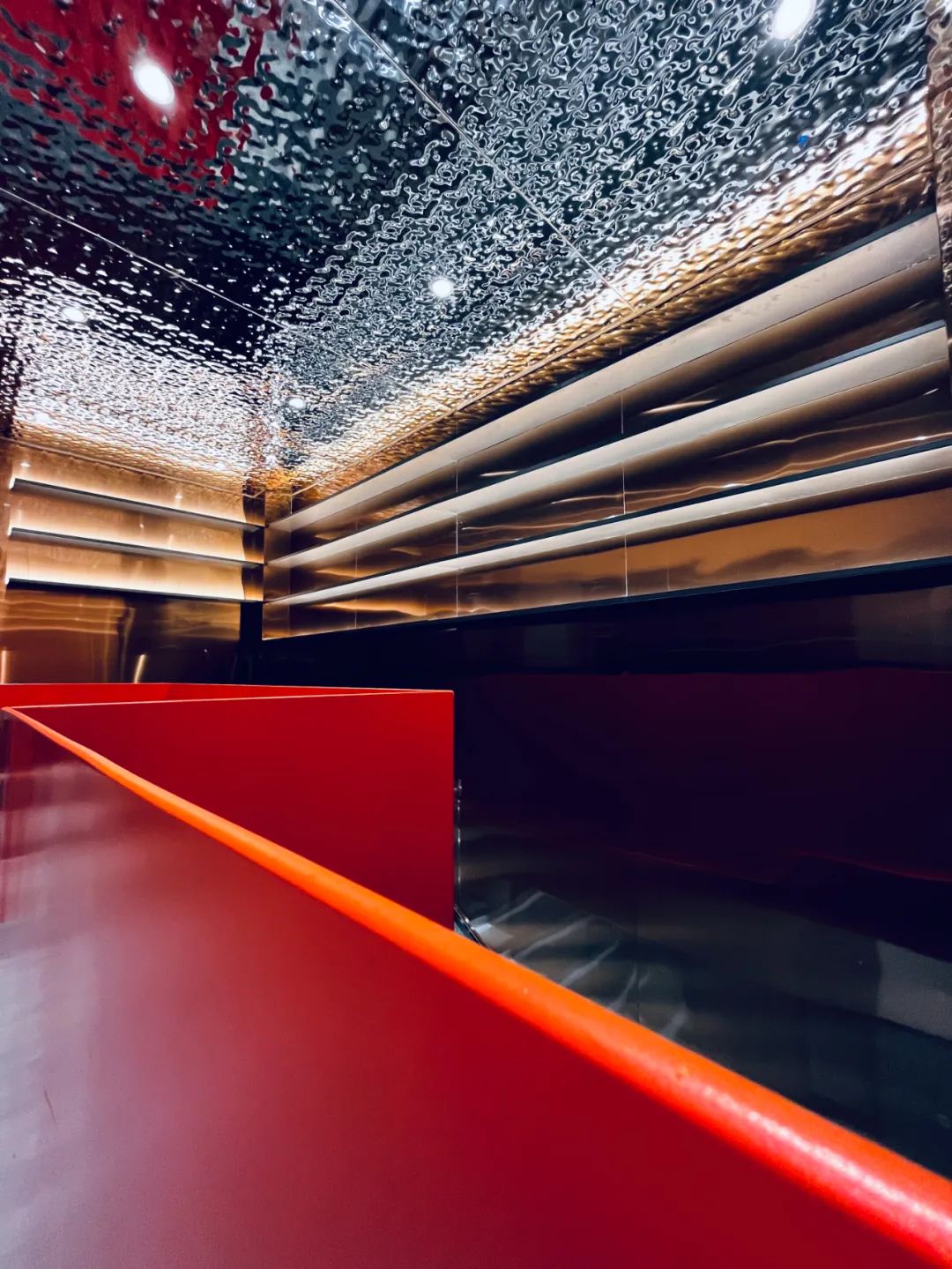 楼梯继续沿用的水磨石和金属的搭配,每一阶台阶都设计了灯带,墙上的金属酒架和顶面水波纹不锈钢吊顶进行搭配,让整个楼梯显得设计氛围感十足。与寻常楼梯扶手不同的是,本次扶手使用的是红色不锈钢钢板,简简单单就很出效果。