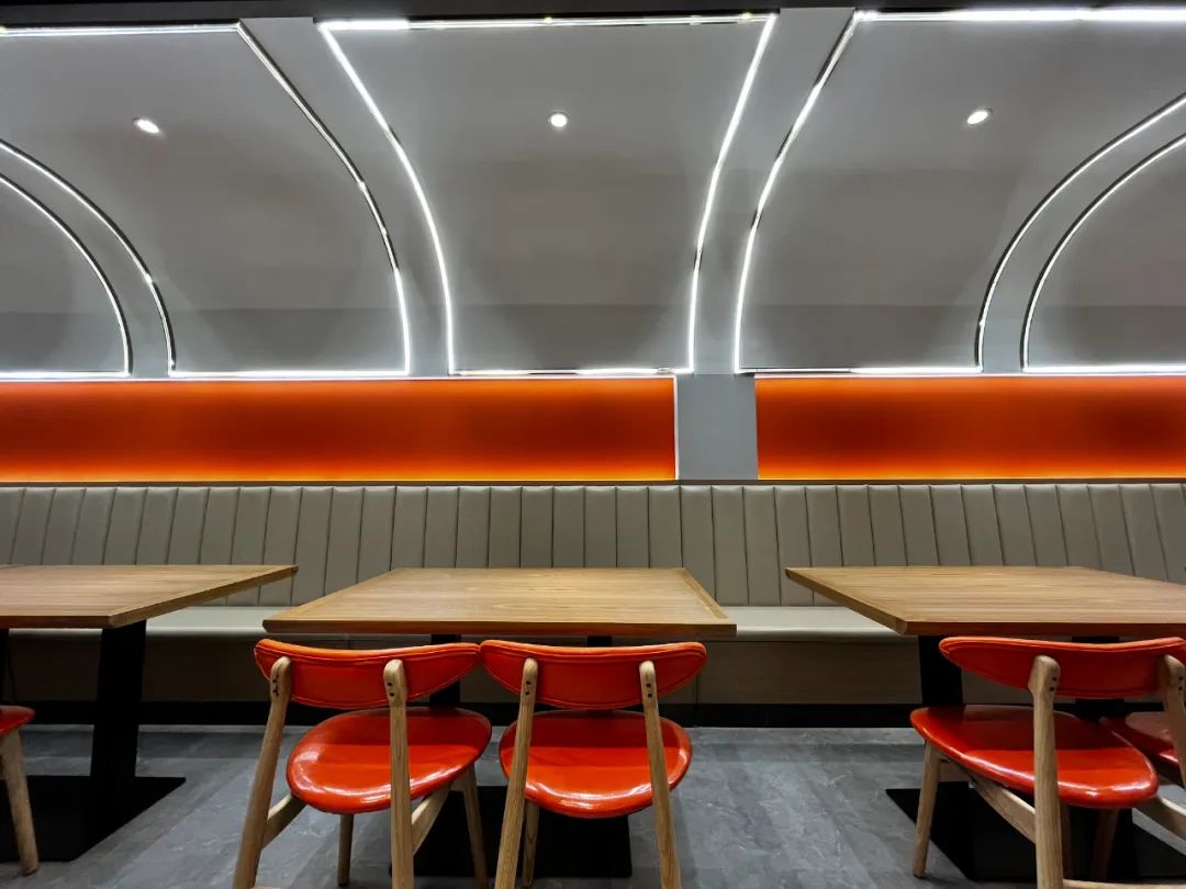 一层大厅分为散座区和卡座区域,散座区墙面使用橙色乳胶漆和水磨石造型来搭配,在分界处用金属线条进行点缀,提高整体设计感。卡座区使用橘色和白色软包进行搭配,好看的同时,坐着也很舒服。
