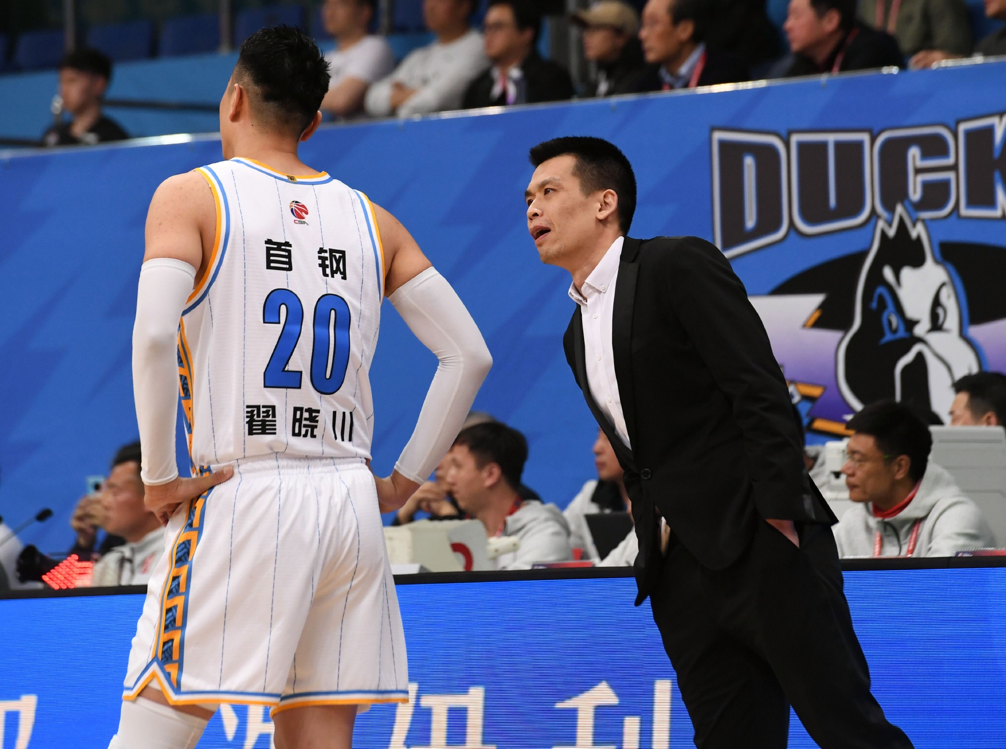 3月5日,北京首钢队主教练解立彬(右)在比赛中与队员翟晓川交流。新华社记者 张晨霖 摄